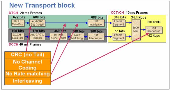 新的 33kbps RMC实现: 当向UE发送无线电承载设置消息时,3GPP 规范最初允许为传输块选择“无信道编码”。当传输块为DTCH选择“无信道编码”时。所有其它参数,如传输时间间隔、DCCH配置和传输块多路转换都保持与12.2 kbps RMC相同。在提议的协议中,除增加未编码传输块的大小外,所有信令和物理层参数都没有变化,并去掉了信道编码和速率匹配功能。在无线电承载设置消息中,测试装置指示UE在DTCH的上行链路和下行链路中使用“无信道编码”。此外,为保持信道对称和所有其它传输格式的可变常数,测试装置也指示增加未编码传输块的大小,这样,在测试装置和UE传输通路中的第一个交织级上就出现同样大小的块(如图2所示)。图4描述为新协议改进的DTCH。在新协议中,672 DTCH 数据比特在 一个20ms帧内发送,这样,原始数据率就从12.2kbps增加到33.6kbps,然后再增加16位 CRC比特。所构成的688个数据块直接加到第一个交织器,以供进一步的处理。应注意当 DTCH选择了“无编码”这一选项时,就不需要上行链路或下行链路中DTCH bit的穿孔(由速率匹配块提供)。对于上述系统仿真器的33.6kbps RMC实现,在UE物理层或协议配置上不需要进行任何实现改变。